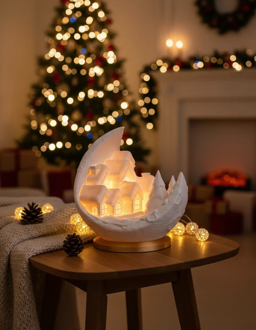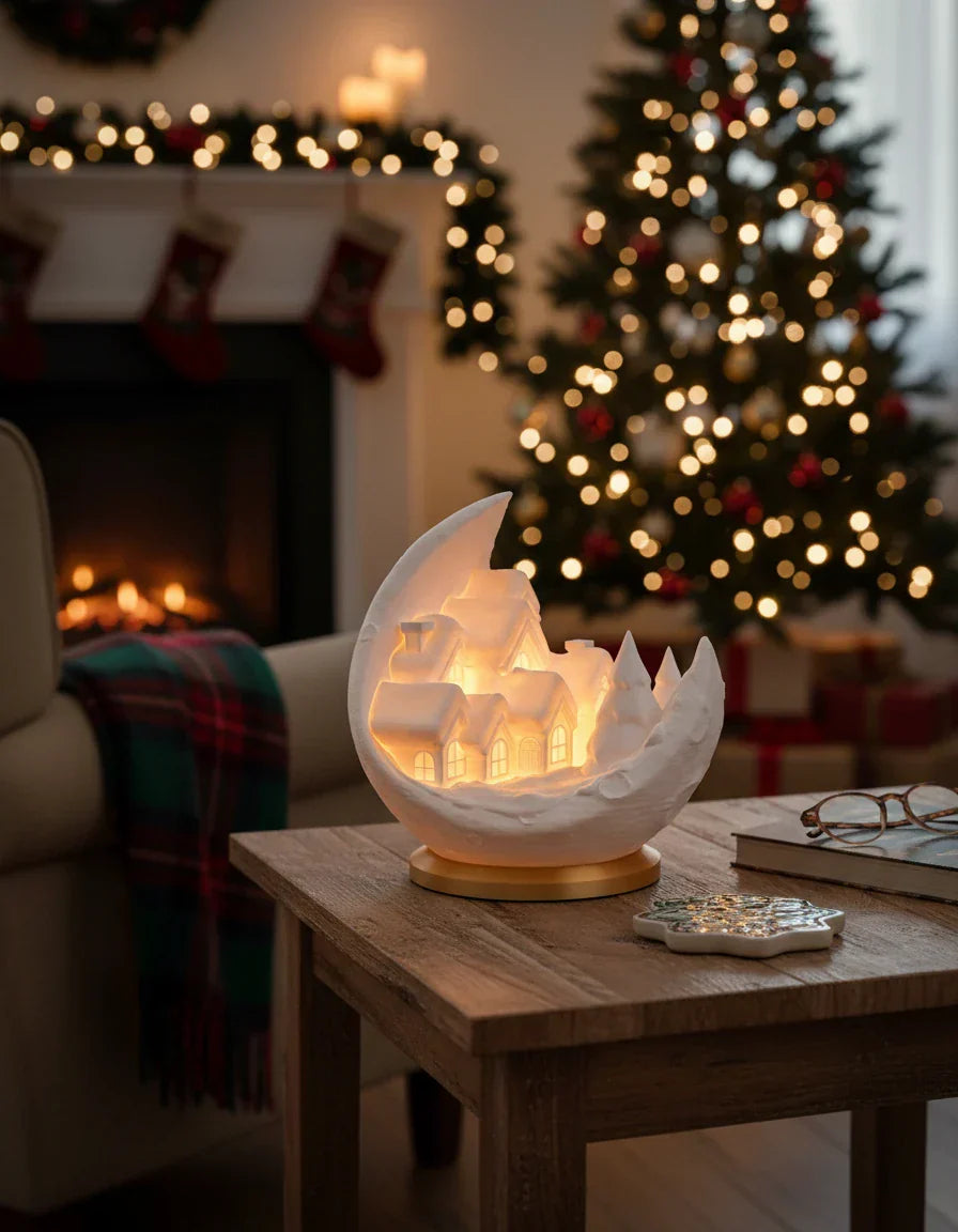 Deze lamp voegt een magische en rustgevende sfeer toe aan je interieur, niet alleen tijdens kerst maar ook het hele jaar door. Dankzij het subtiele maanlandschap en het charmante dorpje, is het een stijlvolle eyecatcher op een zijtafel, vensterbank of als nachtlampje in de slaapkamer.